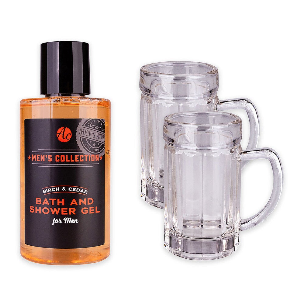 Cadeauset voor mannen in geschenkverpakking, inclusief 140ml bad- & douchegel, 2 x borrelglaasjes in de vorm van een bierpul (elk 4cl), geur: berk & ceder, kleur: bruin.